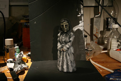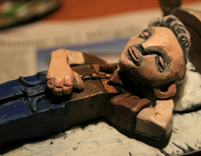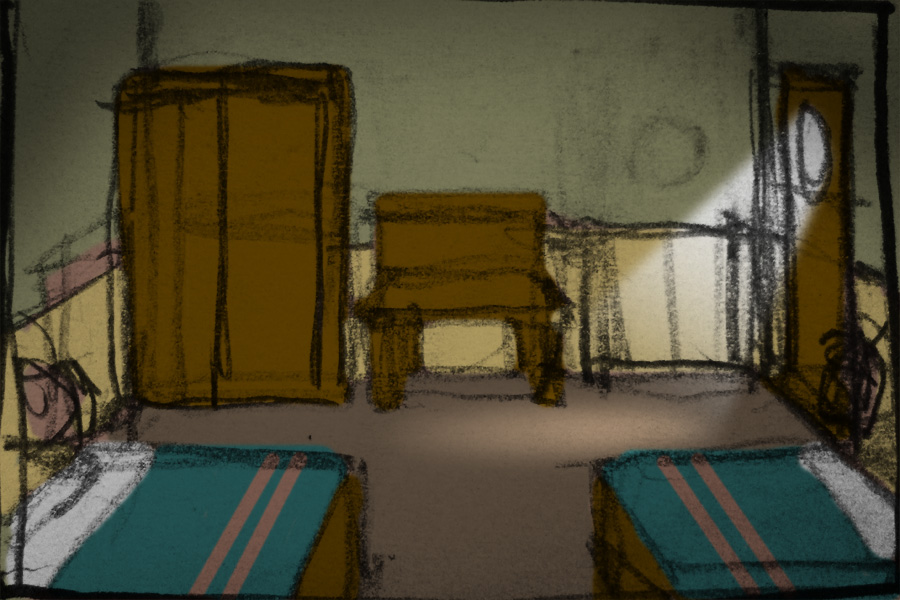 Second draft: Combining the elements resulted in a flat image with low contrast range. Everything looks even and brown. Mr Morton is unfortunately lit. His face and body blends with the background, making the image a bit hard to read. It's also a bit claustrophobic. It feels as if we're invading Mr Morton's personal space, rather than kneeling down beside him to listen to his pained last words.