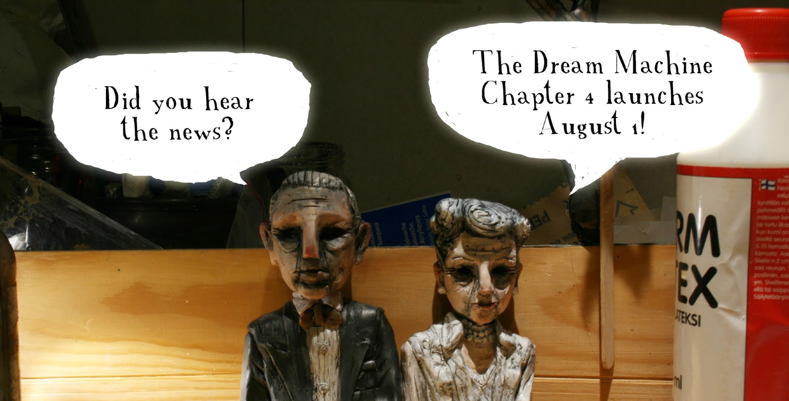 As some of you have already noticed, strange things have started to happen with The Dream Machine lately.The good news is that we're finally getting ready to release Chapter 4. The final assets are being made as I type this, and testing is going really well. Hopefully we'll have a date very soon.